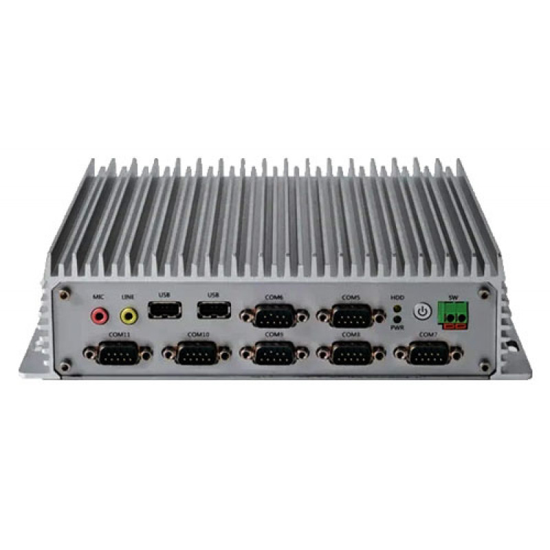 Industrial fanless box PC with Intel J1900 CPU, 11 COM ports, dual LAN, HDMI + VGA display, Mini PCIe expansion, and DC12V input via M12 connector.